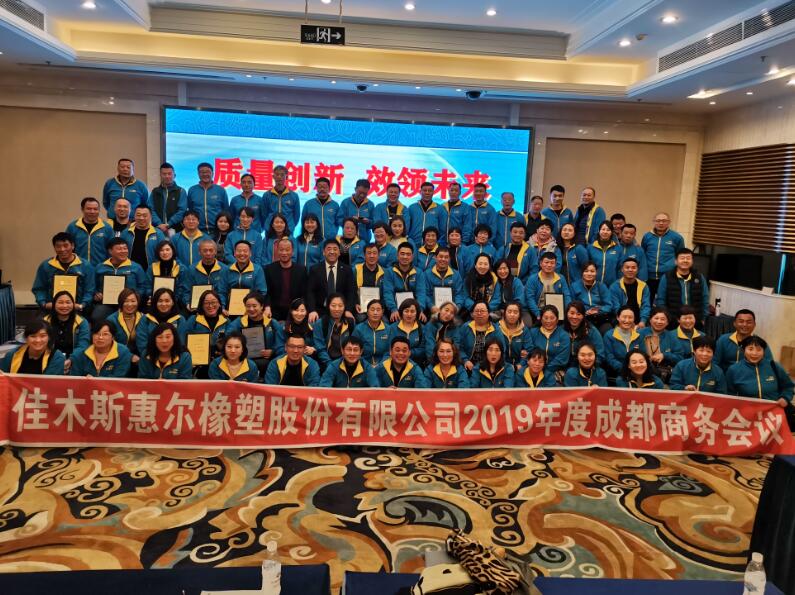 2019年11月25日,值此辭舊迎新之即,佳木斯惠爾橡塑股份有限公司2019-2020年度商務會議在四川成都圓滿召開,來自全國范圍的100多家經銷商代表歡聚一堂,共謀發(fā)展。會議總結了2019年營銷工作,直面矛盾問題,科學預判形勢,就2020年營銷工作進行了部署和落實,會場充滿熱烈喜慶、奮發(fā)向上的氣氛。